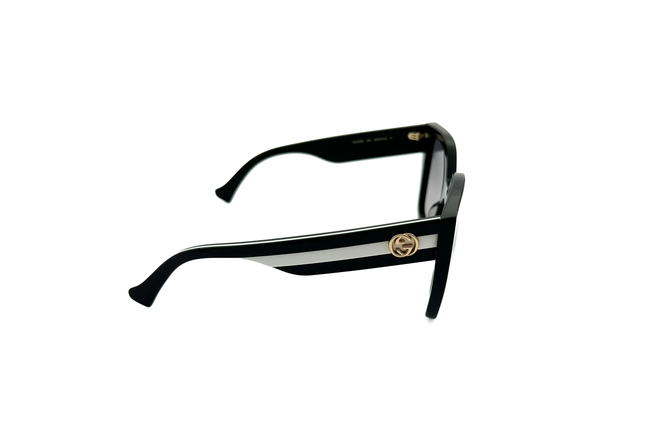 The Gucci GG1300S-004 sunglasses are a sophisticated and stylish accessory designed for those who appreciate high-end fashion with a modern twist. Featuring an oversized square frame made from high-quality black acetate, these sunglasses offer durability and a bold aesthetic. A sleek white stripe detail enhances the design, adding a striking contrast to the frame’s deep black color.